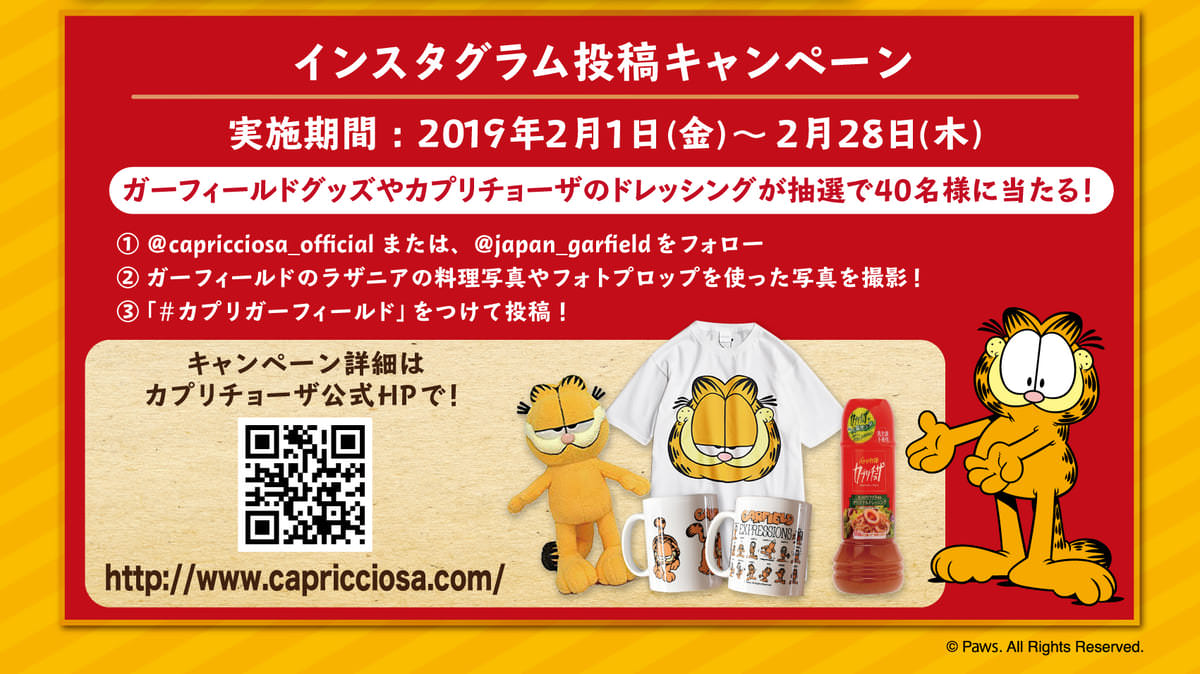 カプリチョーザ公式インスタグラムまたはガーフィールド公式インスタグラムをフォローして投稿をすると、ガーフィールドグッズやカプリチョーザのドレッシングが抽選で40名にプレゼント!