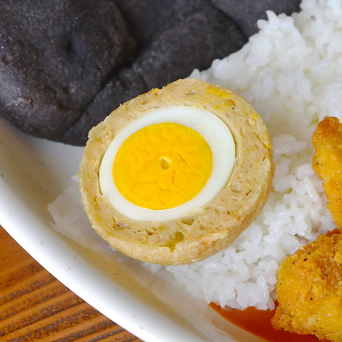 - レッドカリー(中辛)、フライドチキンとスコッチエッグ添え ライスとブラックナン付き