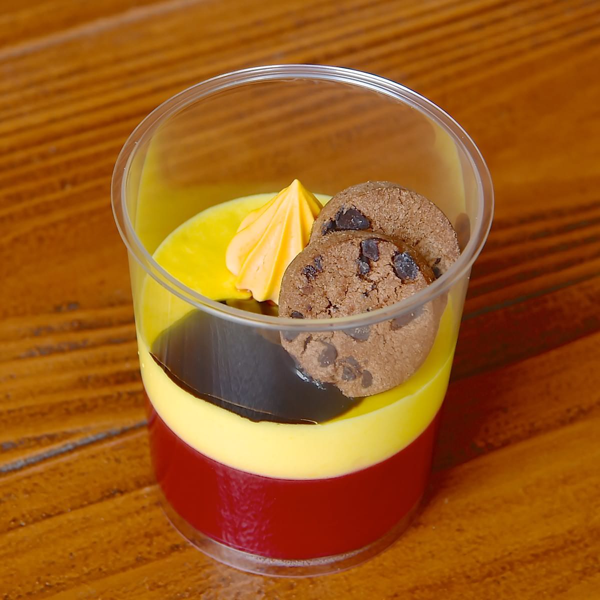 赤いラズベリーゼリーと黄色いムース、チョコレートソースでスーパースーツを表現。