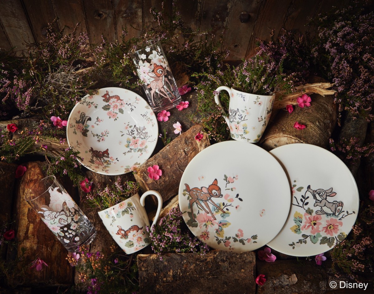 子鹿のバンビと、彼の親友である小さなウサギのとんすけ、シャイで愛らしいスカンクのフラワー、そしてキャス キッドソンのトレイリングローズプリントが散りばめられた総柄デザインのアイテムは、世代を問わず楽しむことができます。