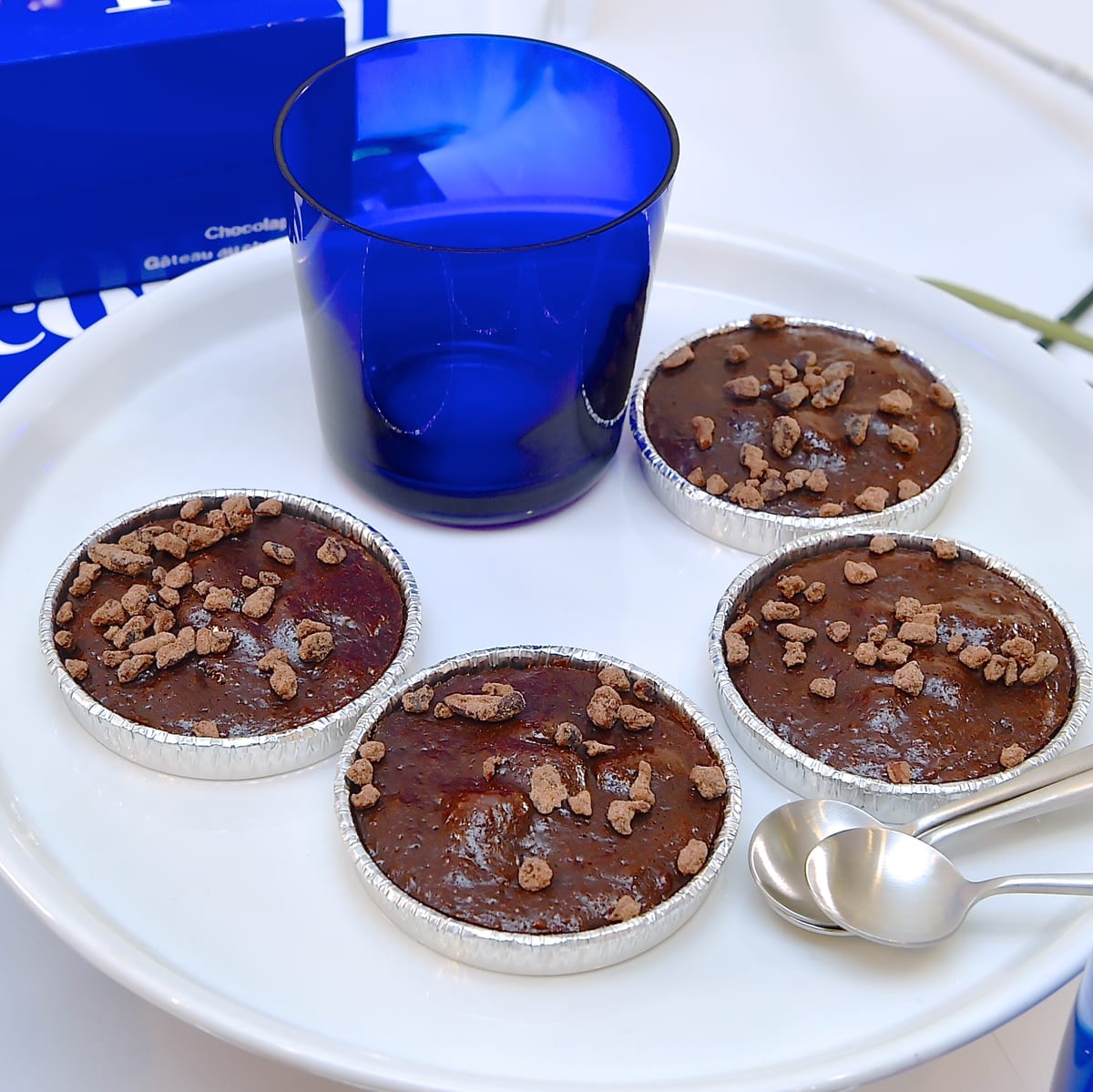 どちらにもカカオ豆をフレーク状に砕き甘くキャラメリゼした「カカオニブ」がトッピングとしてついており、クランチ食感とキャラメリゼした甘さ、カカオ本来の苦味をバランスよく感じることができ、ガトーショコラとの食感のコントラストも楽しむことができます。