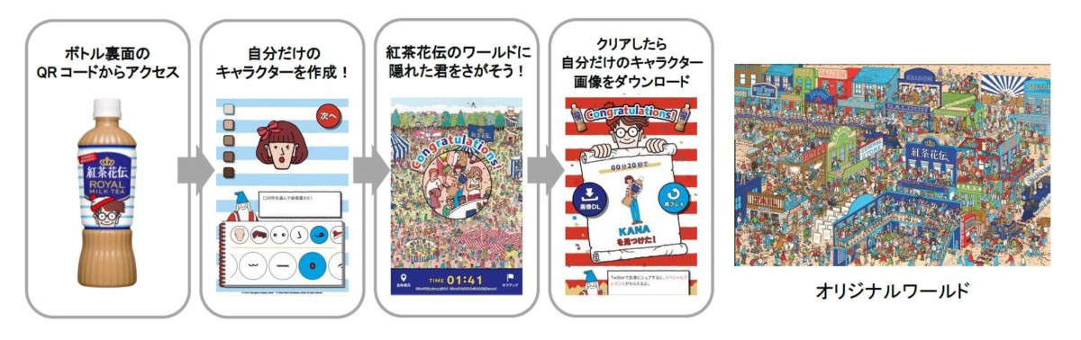 また、みんなが作ったキャラクターが一堂に集まったワールドをキャンペーンの中で順次公開、更新していくほか、キャラクターを作成しなくても、紅茶花伝のボトルを持ったウォーリーをさがすゲームも楽しめるなど、何度も購入し、アクセスしたくなるようなゲームとなっています。