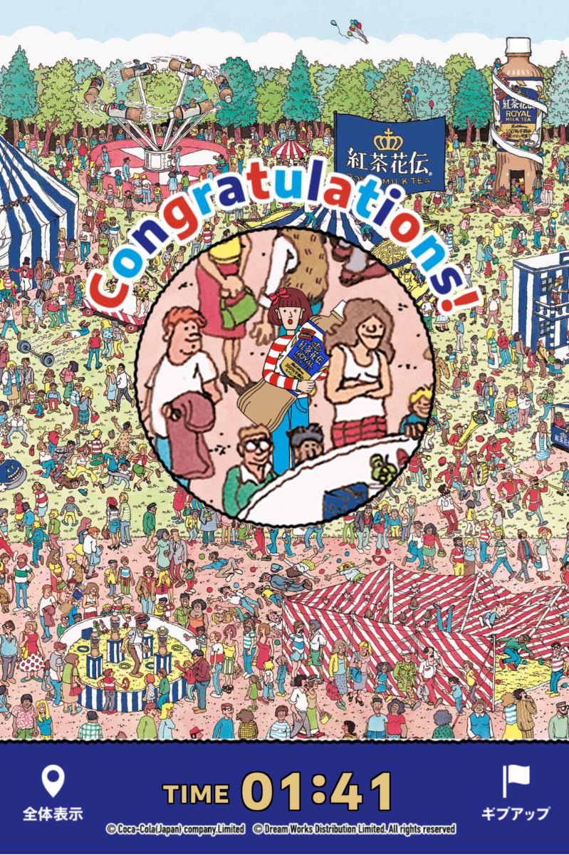そのキャラクターが、紅茶花伝と「ウォーリーをさがせ!」が融合したオリジナルワールドに紛れ込みます。