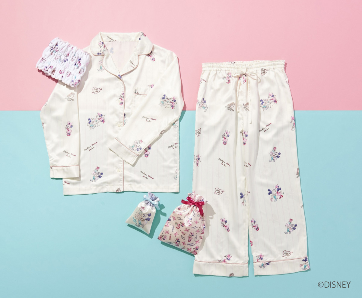 プリントミニタオル(800円)、スマートフォンカバー(2,800円)、コンパクトミラー(1,400円)、ミニタオル(800円)、ヘアバンド(1,400円)、パジャマトップス(4,000円)、パジャマロングパンツ(4,000円)、ミッキー巾着S(1,000円)、ミニー巾着M(1,800円)