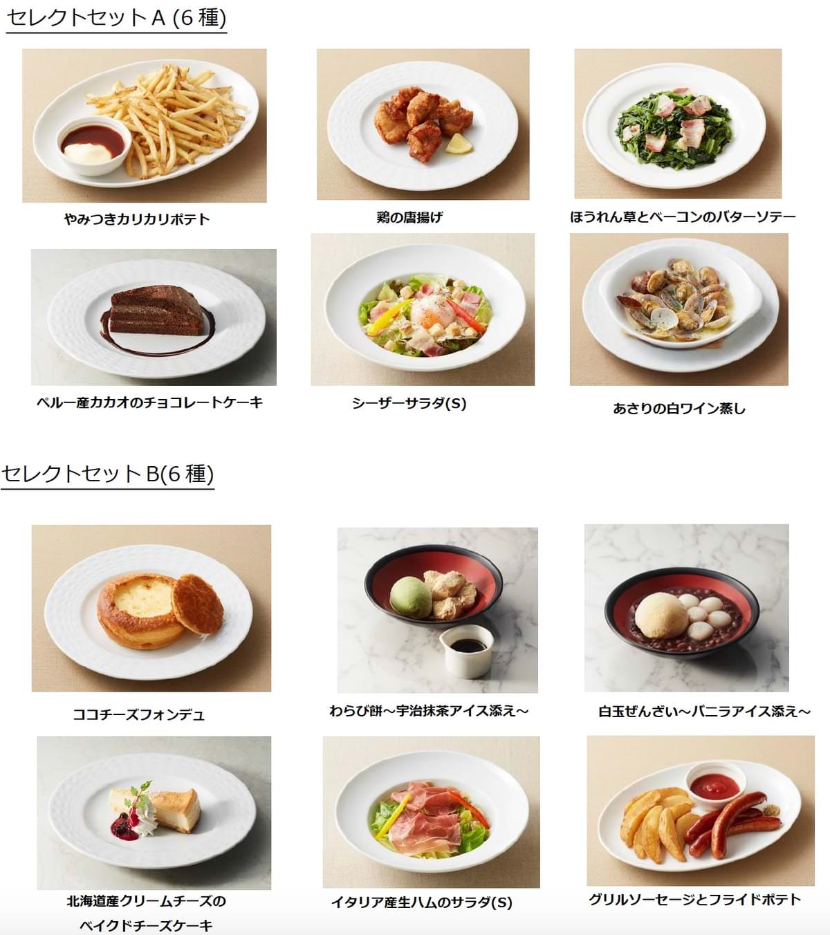 内容:セレクトセットA(やみつきカリカリポテト 、鶏の唐揚げ 、ほうれん草とベーコンのバターソテー 、ペルー産カカオのチョコレートケーキ 、シーザーサラダ(S)、あさりの白ワイン蒸しの6種)/セレクトセットB(ココチーズフォンデュ、わらび餅~宇治抹茶アイス添え~ 、白玉ぜんざい~バニラアイス添え~ 、北海道産クリームチーズの ベイクドチーズケーキ 、イタリア産生ハムのサラダ(S) 、グリルソーセージとフライドポテトの6種)からそれぞれ1種類ずつ選択