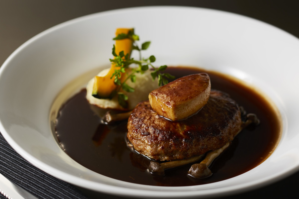 大きくカットされたフォアグラがハンバーグにのっており、見た目も豪華な一皿。