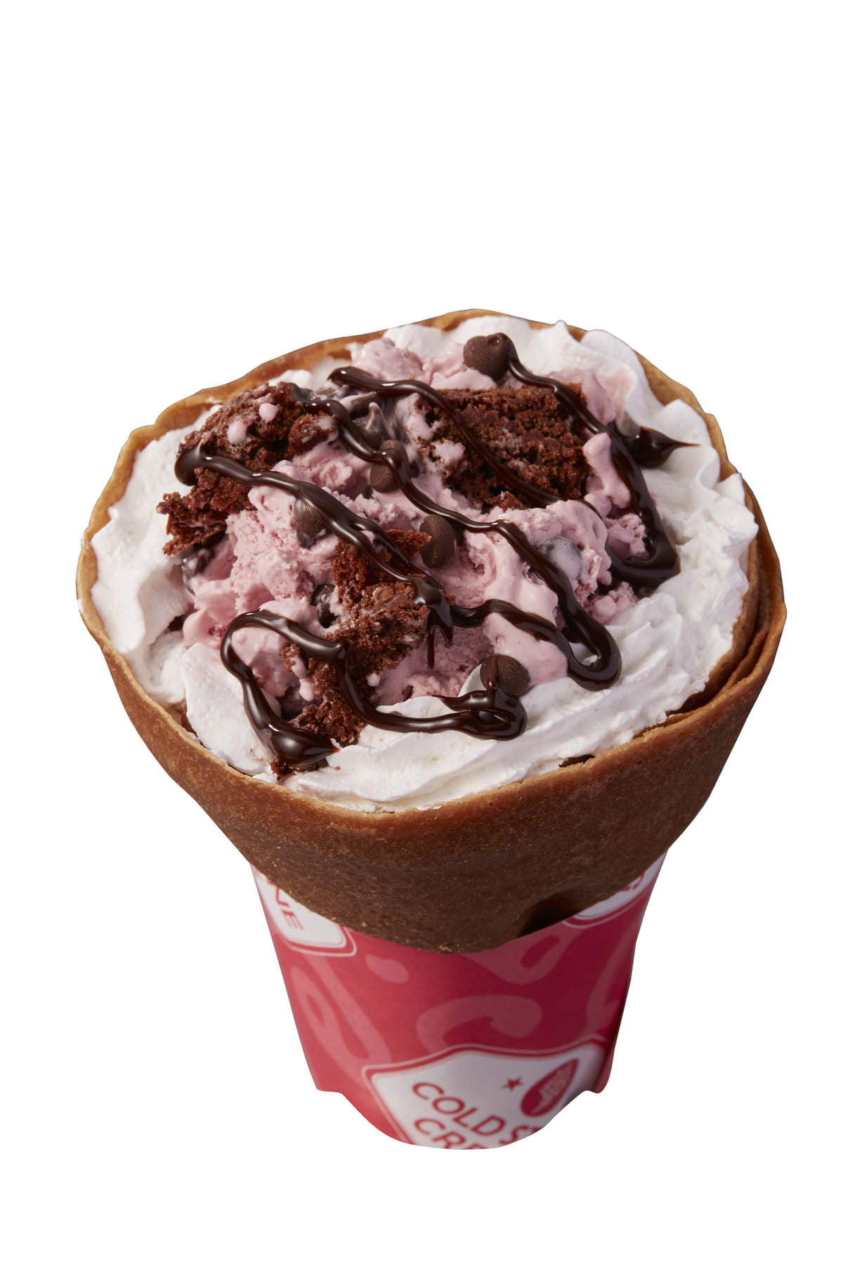 トリプルベリーアイスクリームをチョコクレープ生地で包み、3種のチョコレートをトッピング。