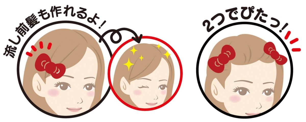 アトやうねりを残さずに前髪を“ぴたっ”ととめられる使いやすさはそのままに、ハローキティのリボンとおそろいの形になりました。