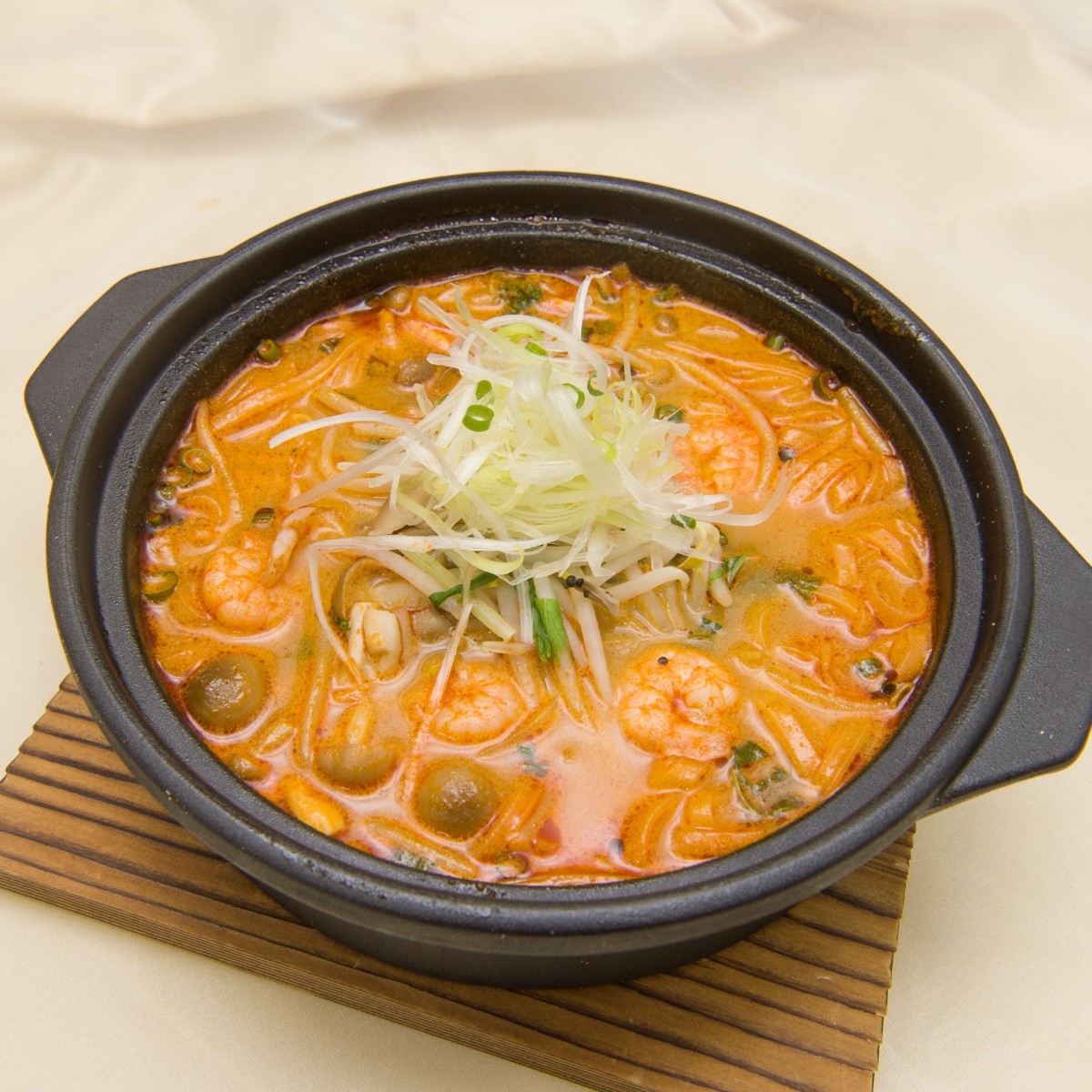 唐辛子の辛みとレモンの酸味がきいたスープにココナッツミルクを加えたトムヤムクンのフォー。