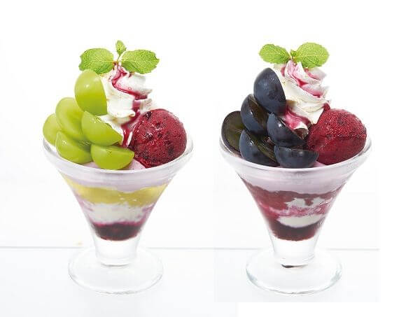 2種類の葡萄のどちらかを選んでトッピングできる、ザ・サンデーやミニパルフェなど7種類☆