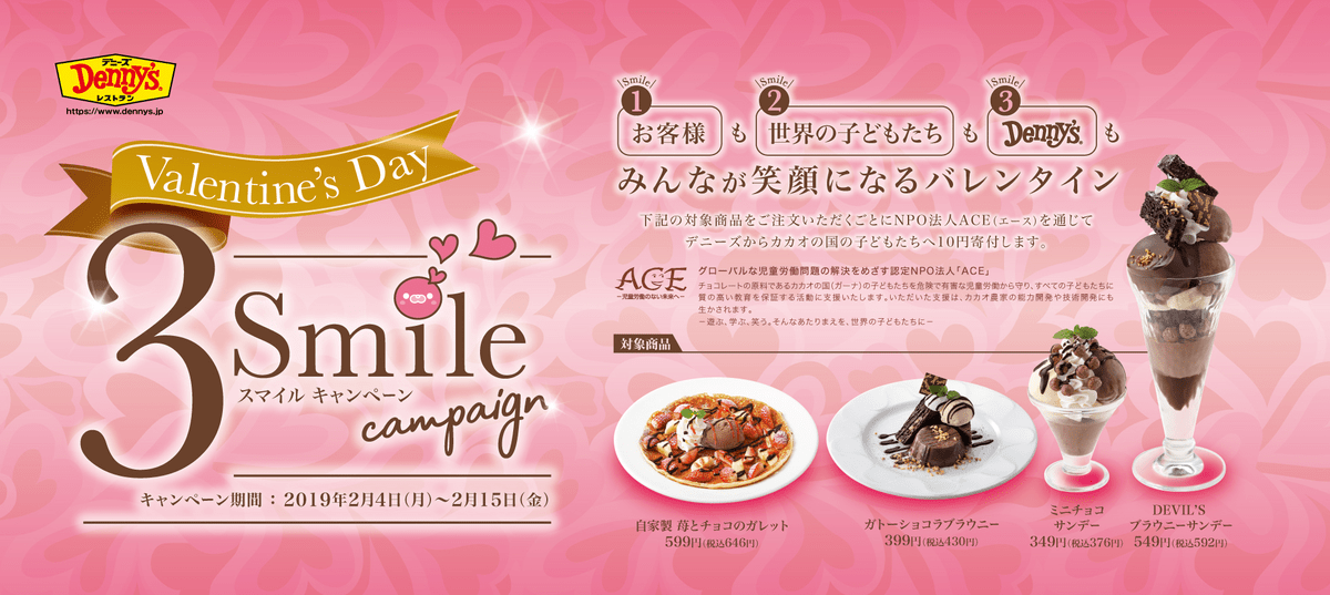 デニーズでは「バレンタイン・スリースマイルキャンペーン」として、バレンタインシーズンにデザートを楽しむ「お客」、寄付によって支援する「世界の子どもたち」、チョコデザートを提供する「デニーズ」の三方が笑顔になる企画を実施します。