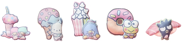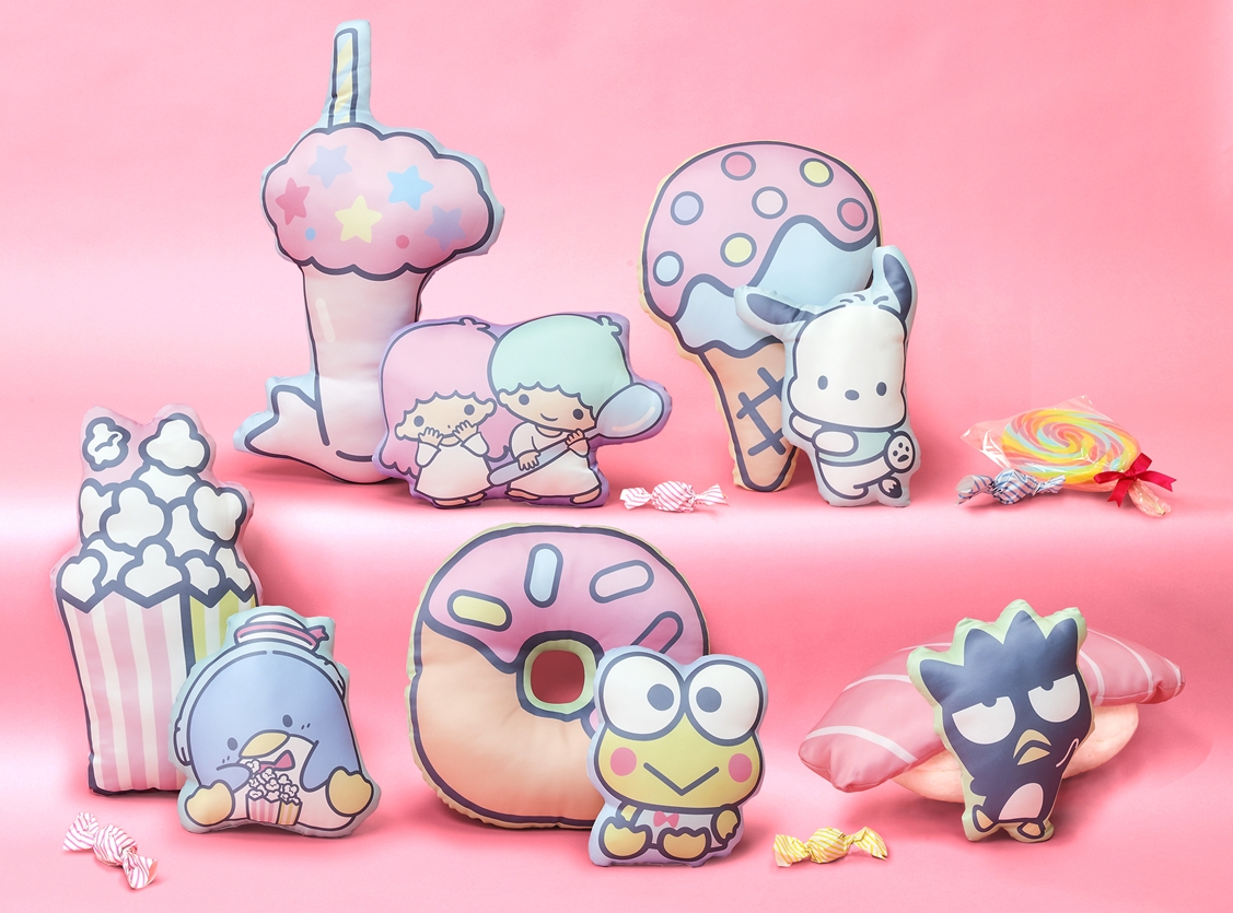 リトルツインスターズのキキ&ララ、ポチャッコ、タキシードサム、けろけろけろっぴとバッドばつ丸が、パフェやお寿司やポップコーンなど食べ物と一緒にクッションに!