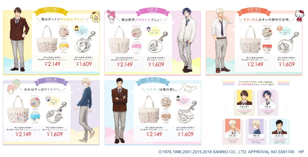 新たに発売される「ランチトートバッグ」と「チャーム」では、サンリオ男子の「吉野俊介」が好きな「ハローキティ」、「水野祐」が好きな「マイメロディ」、「長谷川康太」が好きな「ポムポムプリン」、「西宮諒」が好きな「リトルツインスターズ」、「源誠一郎」が好きな「シナモロール」の5種類が展開されます。