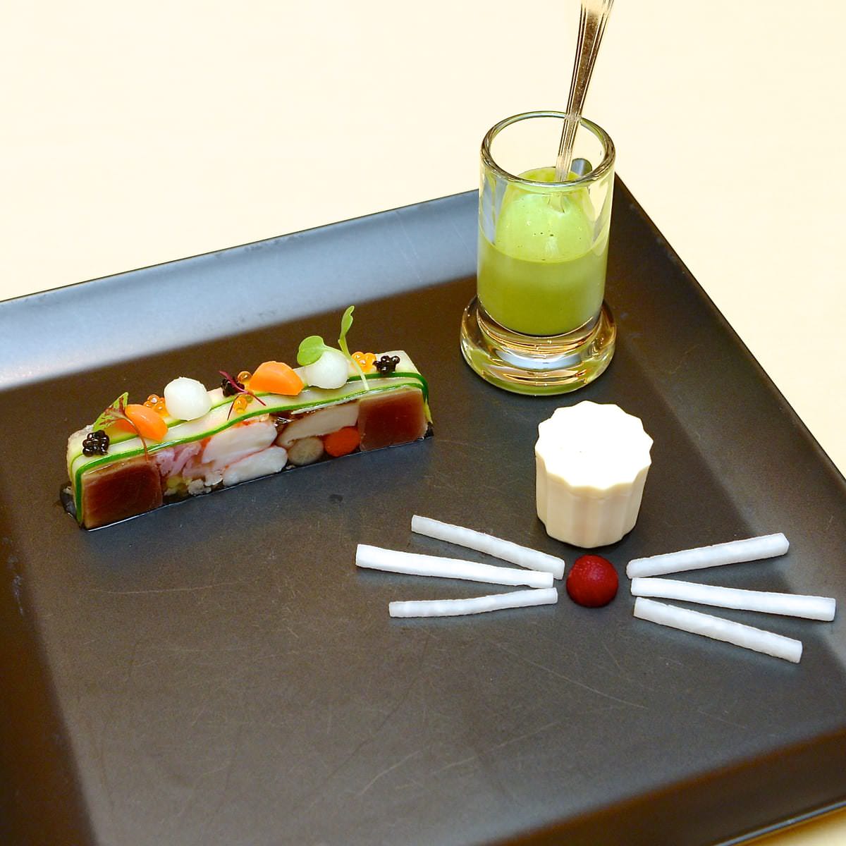 鮪にカリフラワー、ロマネスコ、ブロッコリー、タラバ蟹、しいたけ、にんじん、ごぼうをトマトのコンソメで固めた贅沢なアスピックに、「レミー」が仕上げのソースをかけるように、ゲスト自身で好きなところにグリビッシュソースをかけて料理を仕上げることができる楽しいプレートです。