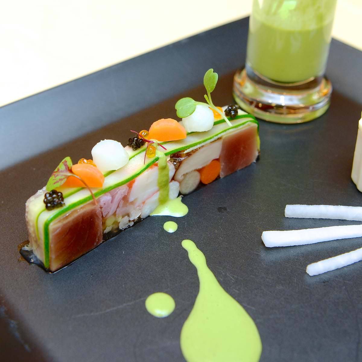 軽くスモークした鮪とタラバ蟹のアスピック グリビッシュソース カリフラワーのムースを添えて