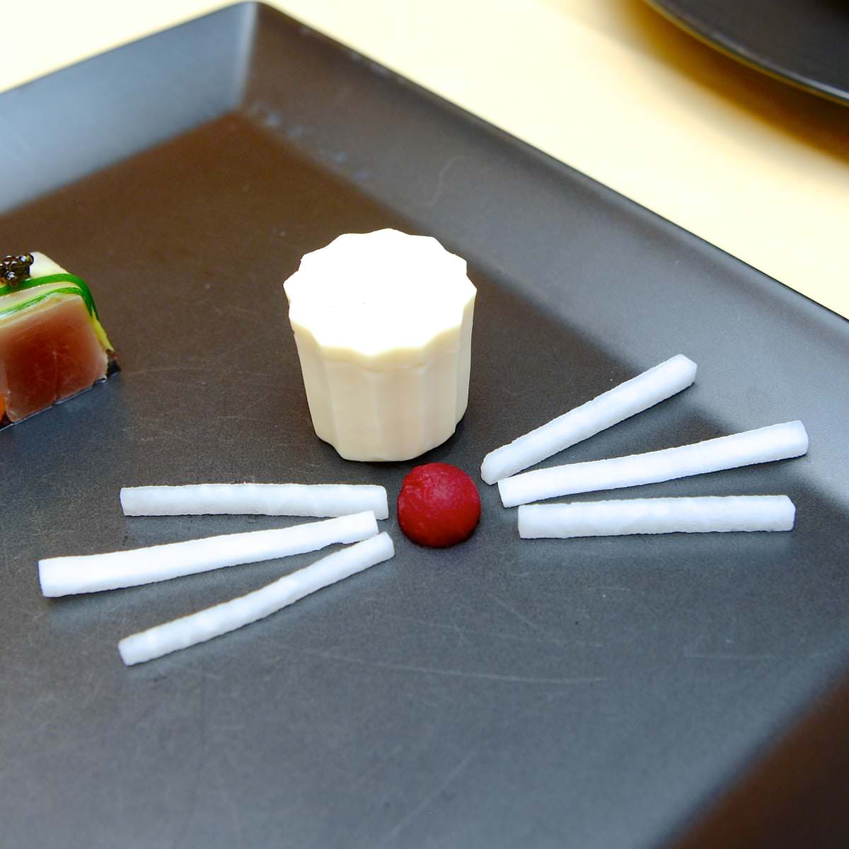 鼻の部分はローストしたレモンのドレッシングでマリネしたビーツとカットした大根でできています。