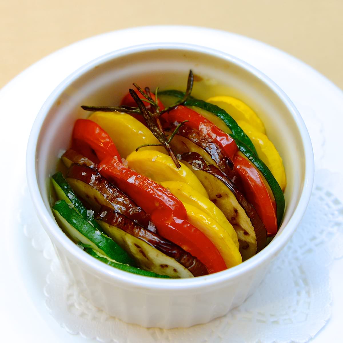野菜本来の味も楽しめるズッキーニやイエローズッキーニ、ナスを3層にあわせて、にんにくやローズマリーで味付けして焼き上げたバイエルディをサイドディッシュとして一緒にいただきます☆