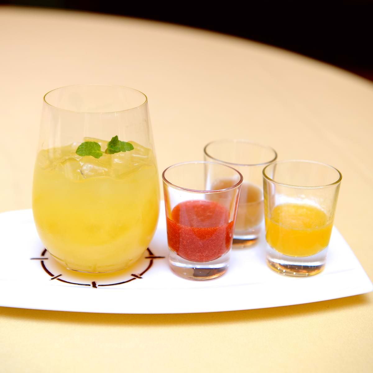 フレッシュなオレンジにバニラシロップを合わせたソース、フレッシュなバナナにマロンのシロップを合わせたソース、フレッシュなストロベリーとフレッシュなラズベリーにグレナデンシロップとストロベリーシロップを合わせたソースの3種。
