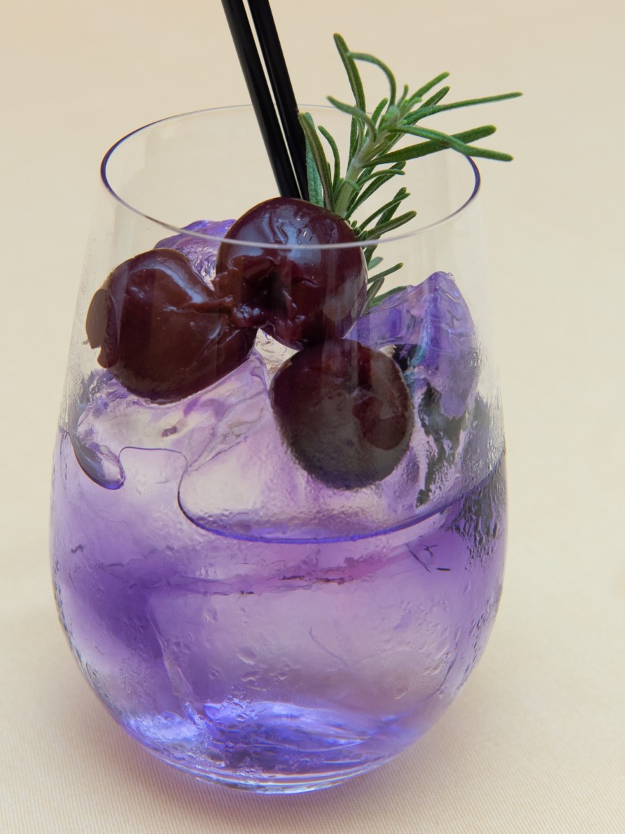 「エンパイア・グリル」で提供されるノンアルコールカクテルは、ダークチェリーコンポートが添えられたブルーマロウティーに、一緒に提供されるミックスベリーのシロップを入れていただきます。