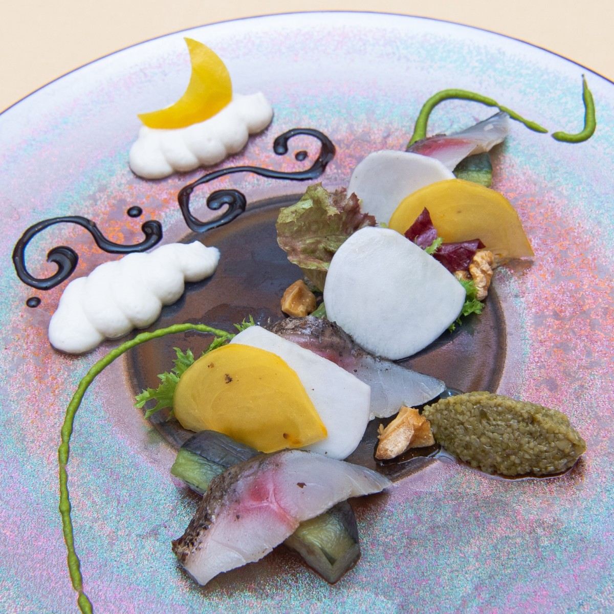 スモークした鯖とスライスした柿、蕪をメインに、蕪のムースで描かれた雲をはじめとした4色のソースが周りを彩ります。