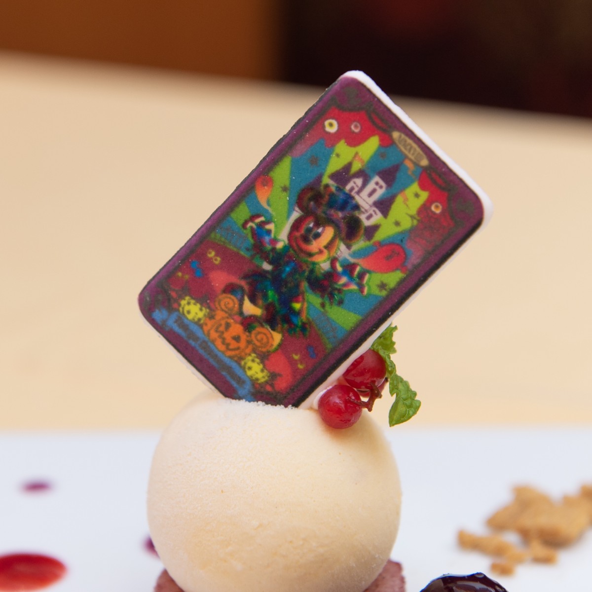 ミッキーマウスのタロットカードをかたどった砂糖菓子が目を引くデザートです☆