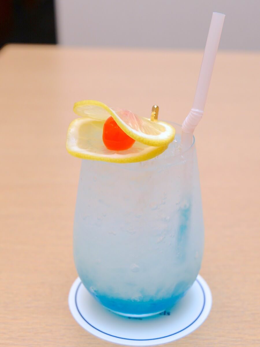 「花 Hana」で提供されるスペシャルノンアルコールカクテルは、カルピスウォーター、洋梨シロップ、レモンジュース、ブルーシロップ、クラブソーダ、スライスレモン、マラスキーノチェリー入り。
