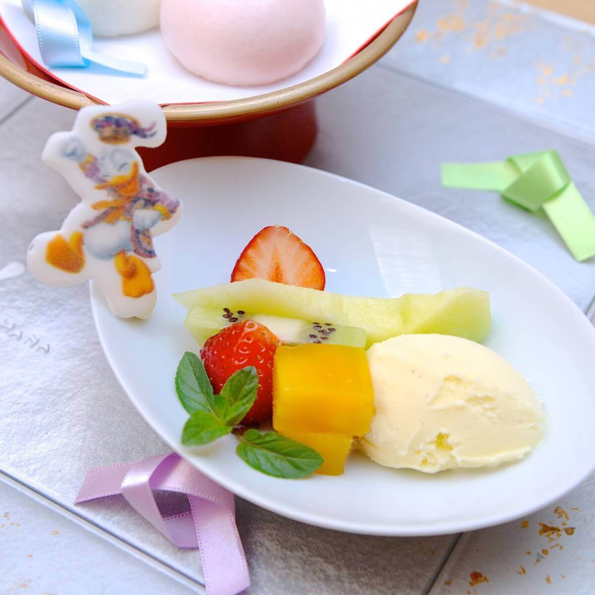 - 紅白饅頭とバニラアイスクリーム フルーツの盛り合わせ