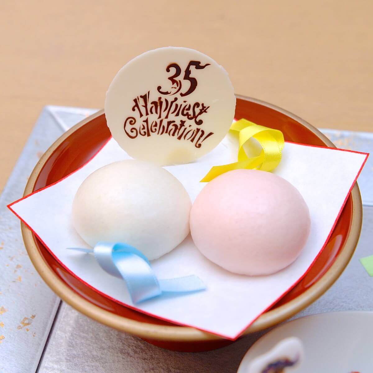 紅白饅頭には、“Happiest Celebration!”のロゴが入ったホワイトチョコも添えられています。