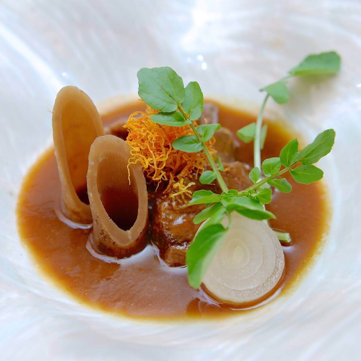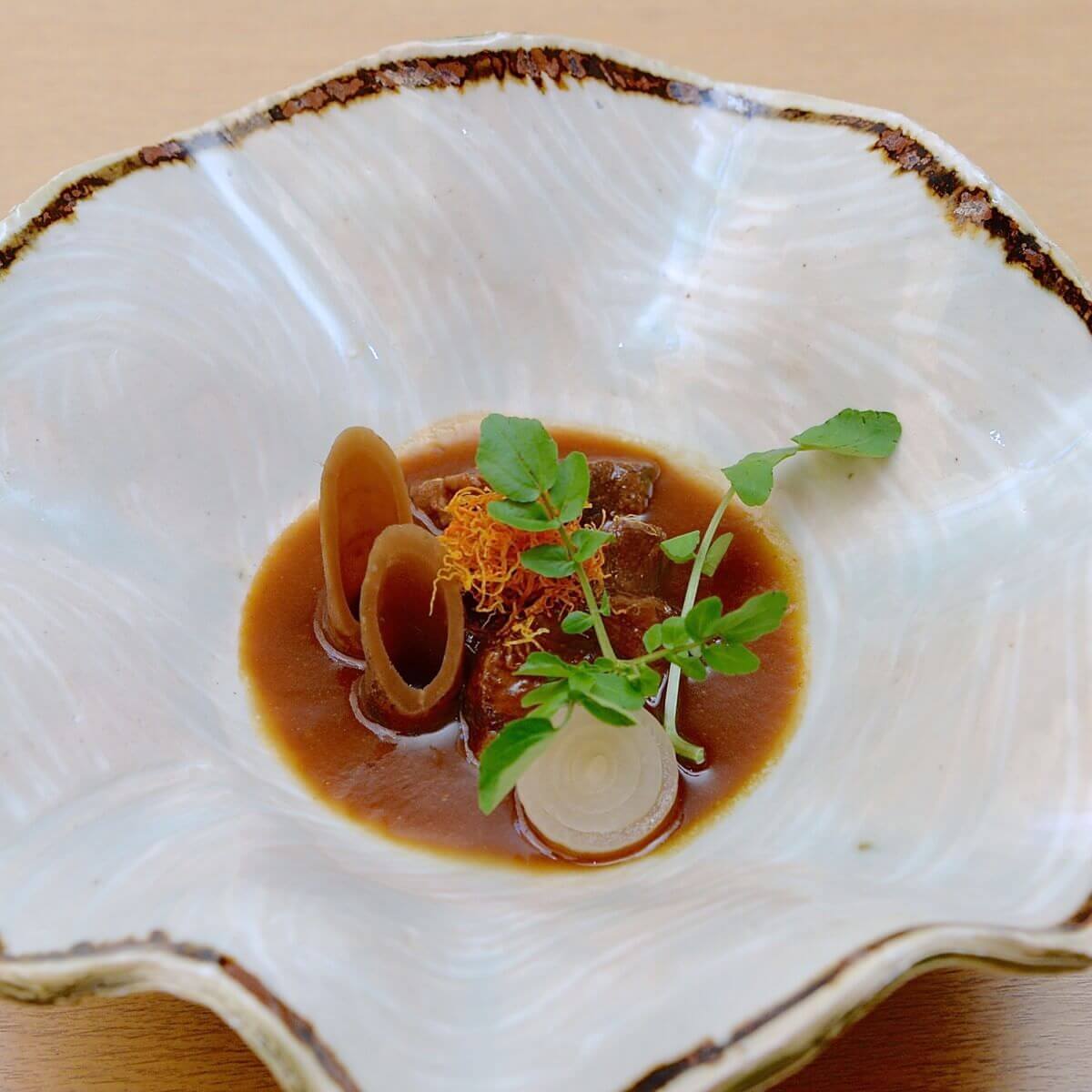 柔らかい牛頬肉に、ごぼうとペコロスが添えられています。