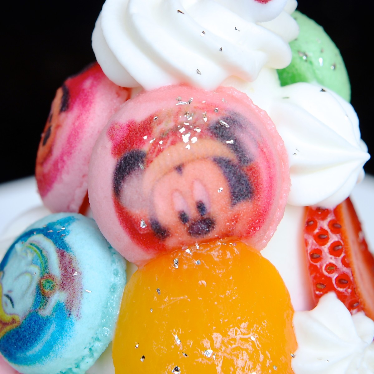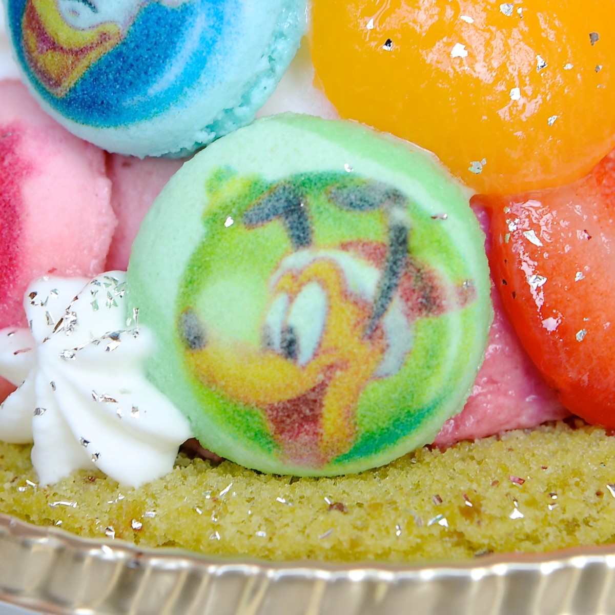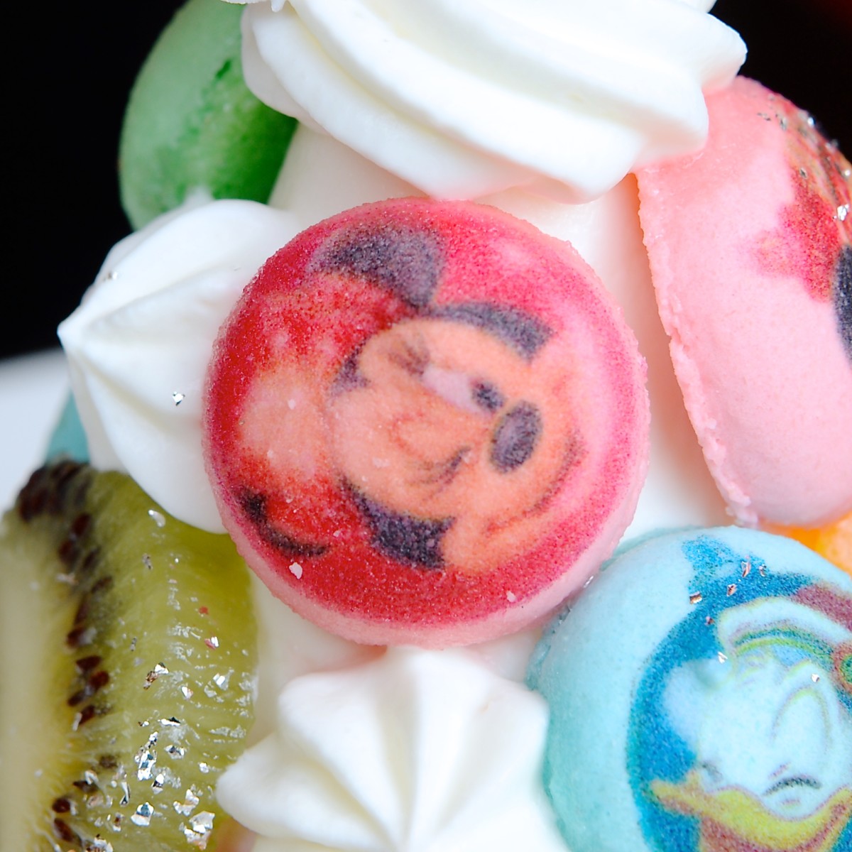 表面にはフルーツや一つ一つ手作りされているミニサイズのマカロンが飾られており、マカロンにはミッキーマウスや仲間たちの顔がデザインされています!
