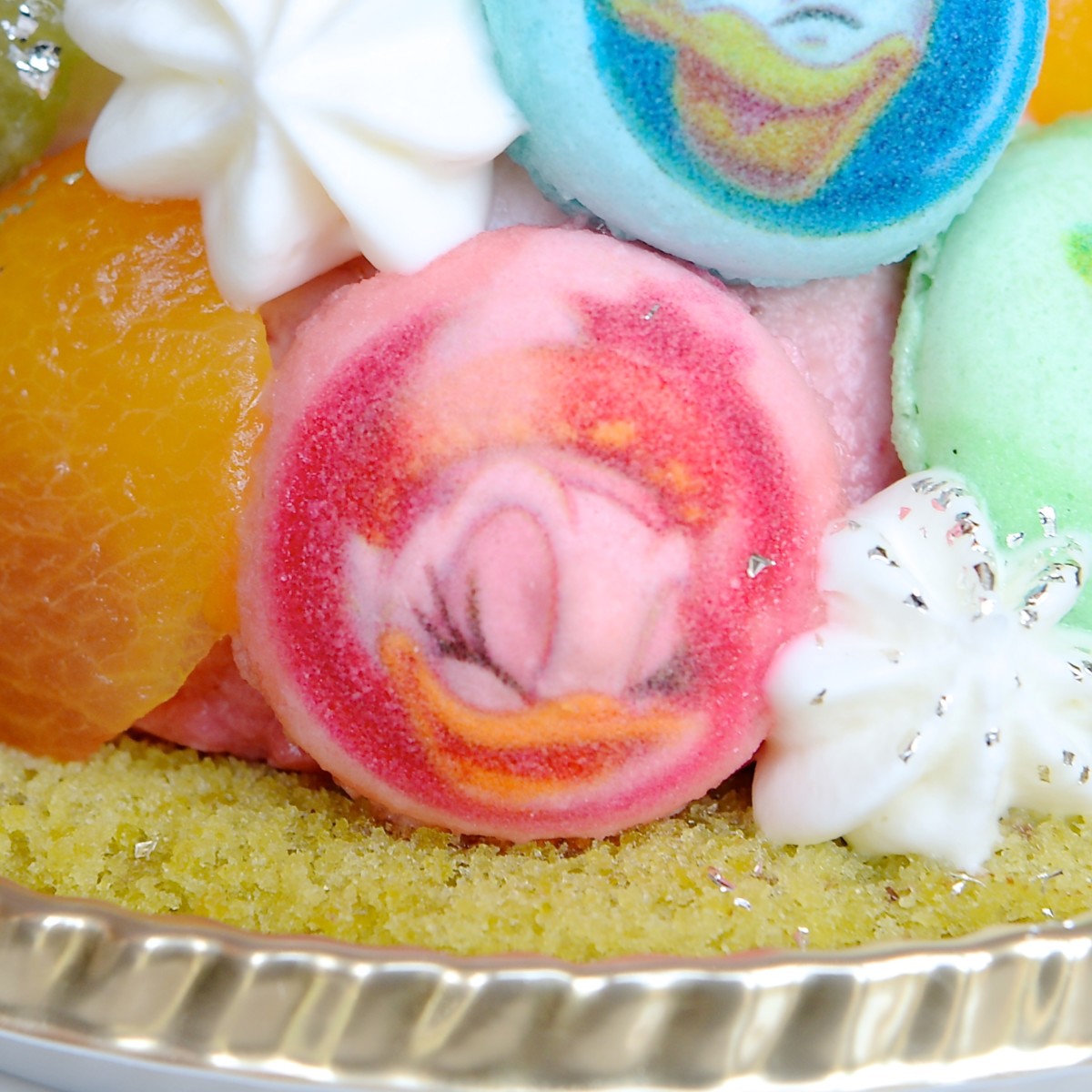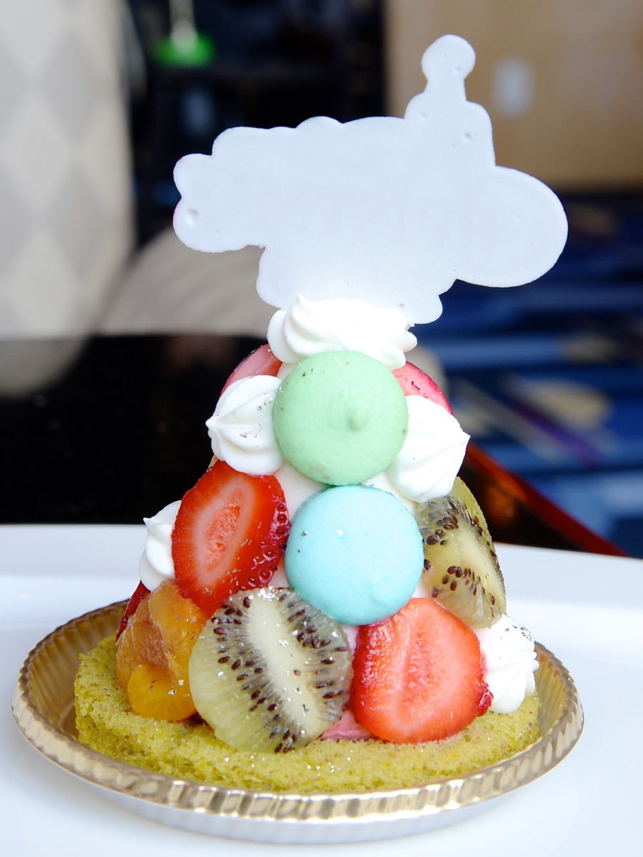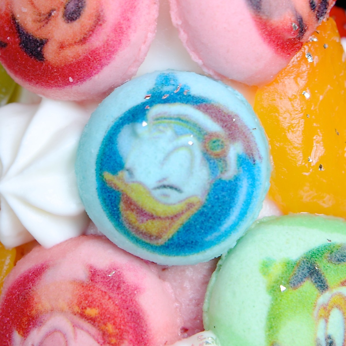表面にはフルーツや一つ一つ手作りされているミニサイズのマカロンが飾られており、マカロンにはミッキーマウスや仲間たちの顔がデザインされています!