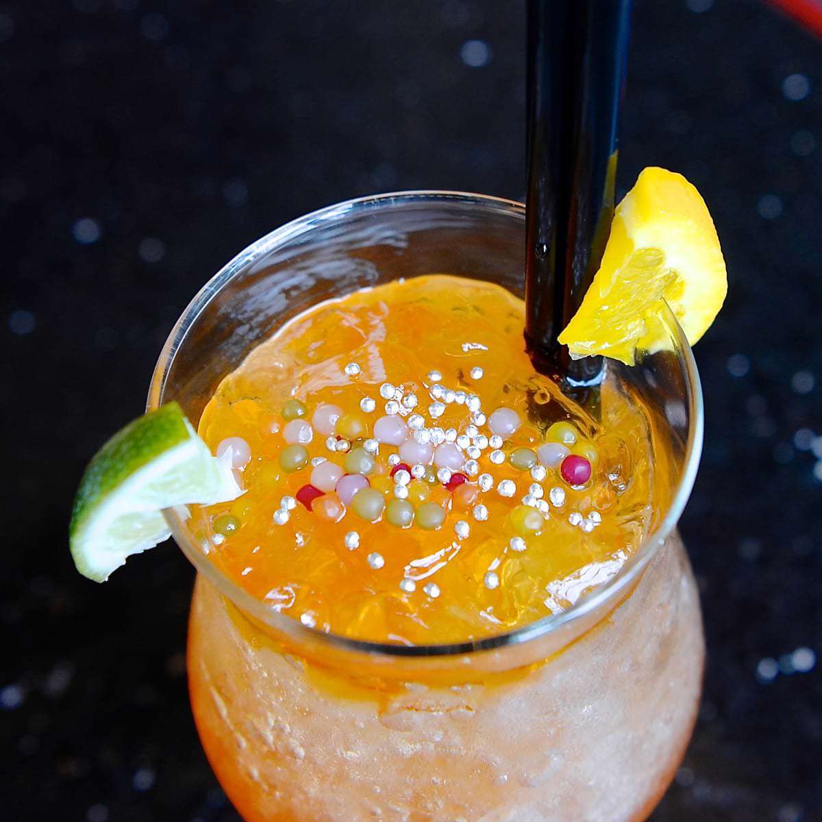パイナップルジュース、パッションフルーツシロップ、グレナデンシロップ、レモンジュースにトニックウォーターを注ぎ、マンゴーゼリーをトッピング。