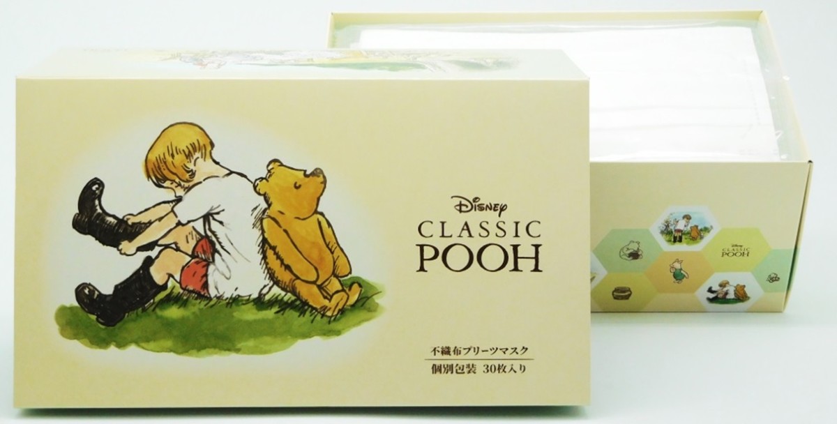 やさしい水彩画タッチで描かれたクラシックプーデザインの箱入りマスク。