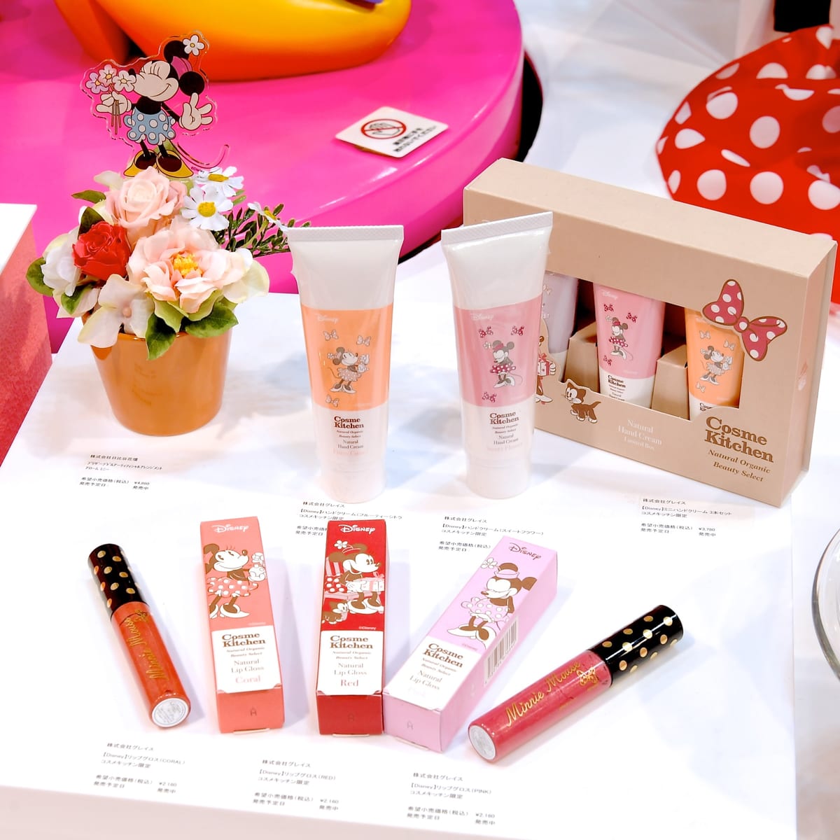 コスメキッチンから、「ミニーマウス」デザインのリップグロスとハンドクリーム。