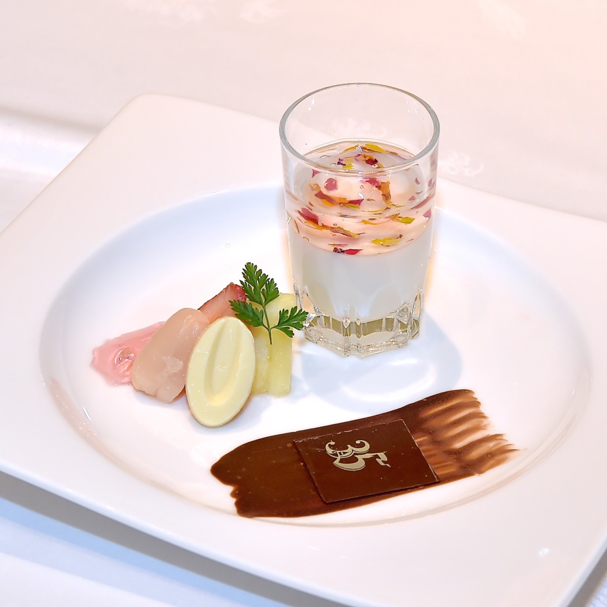 グラスに飾られたエディブルフラワー(食用花)が春らしい華やかな色合いの「季節の杏仁豆腐 花の香りと共に」