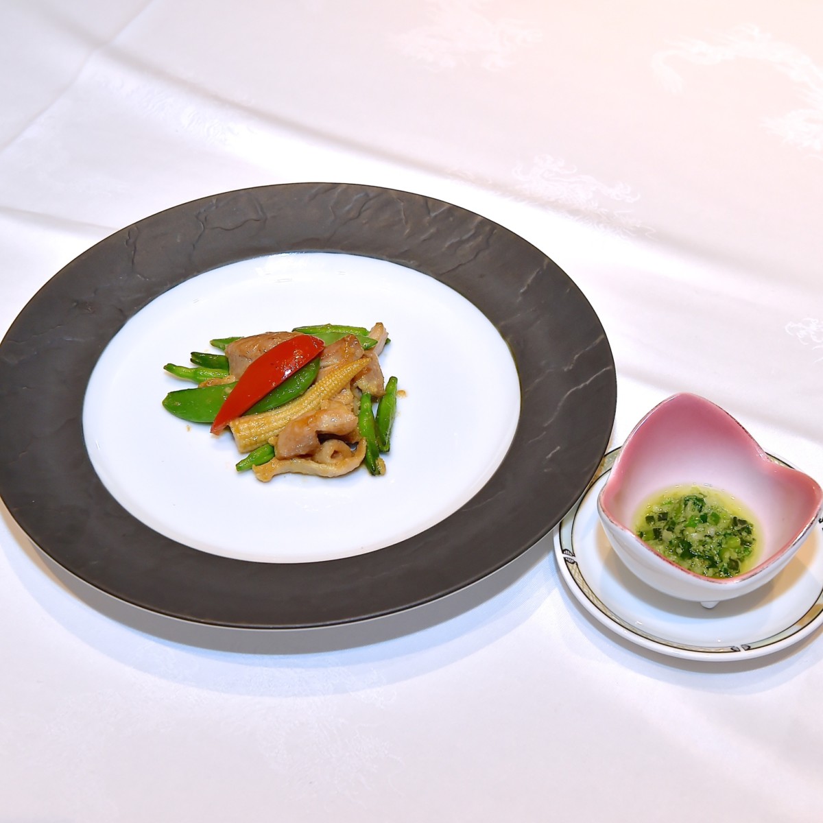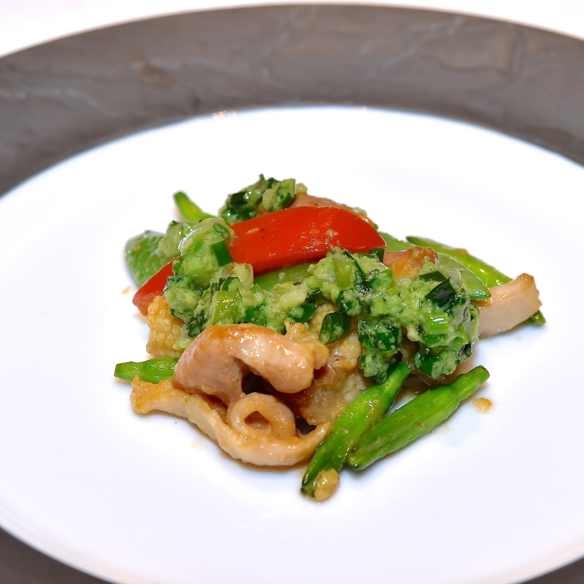 グリーンピースと青葱のソースでいただく「鶏肉と季節の野菜の炒めもの」