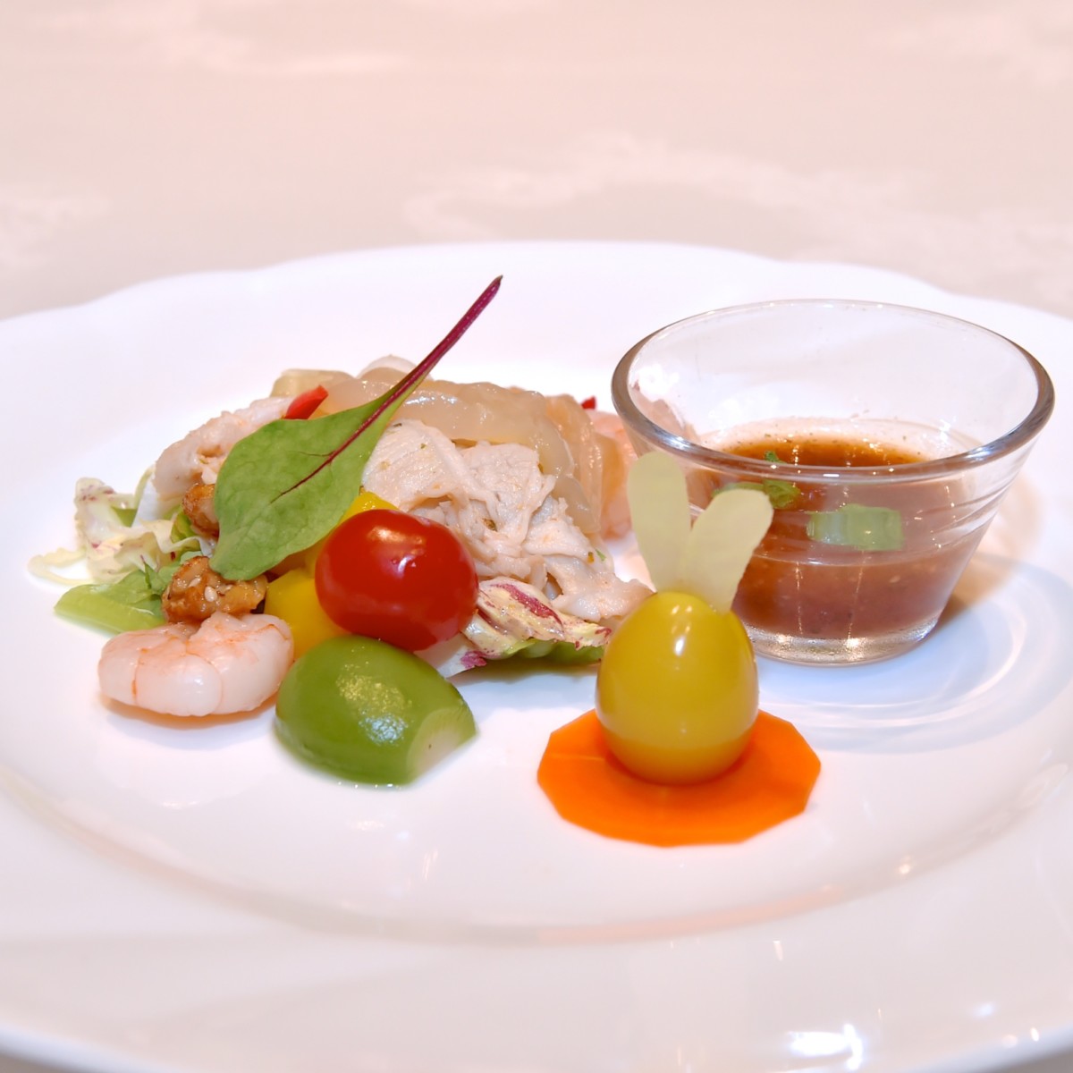 前菜は、フルーツ入りのサラダと豚肉をミントのソースでいただくさっぱりとした一品から。