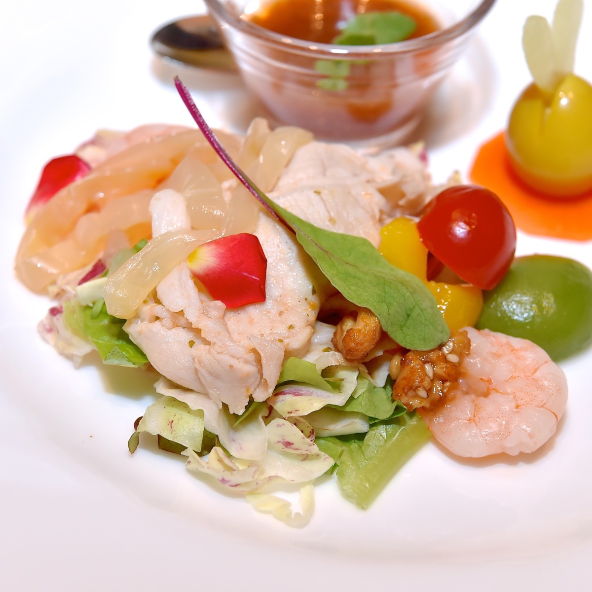 - 白身魚とイカの唐揚げグリーンカリーソース ※別途800円で「白身魚とイカの唐揚げ」を「イセエビの唐揚げ紅麹ソース」に変更できます