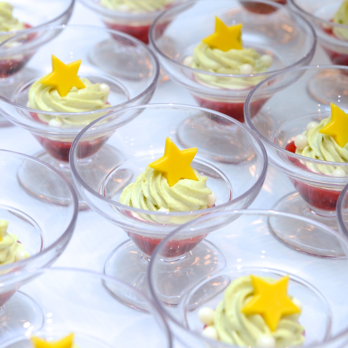 クリスマスツリーをモチーフにしたグラスデザートや、赤・緑・黄色のカラーがおしゃれなムースなどが登場。