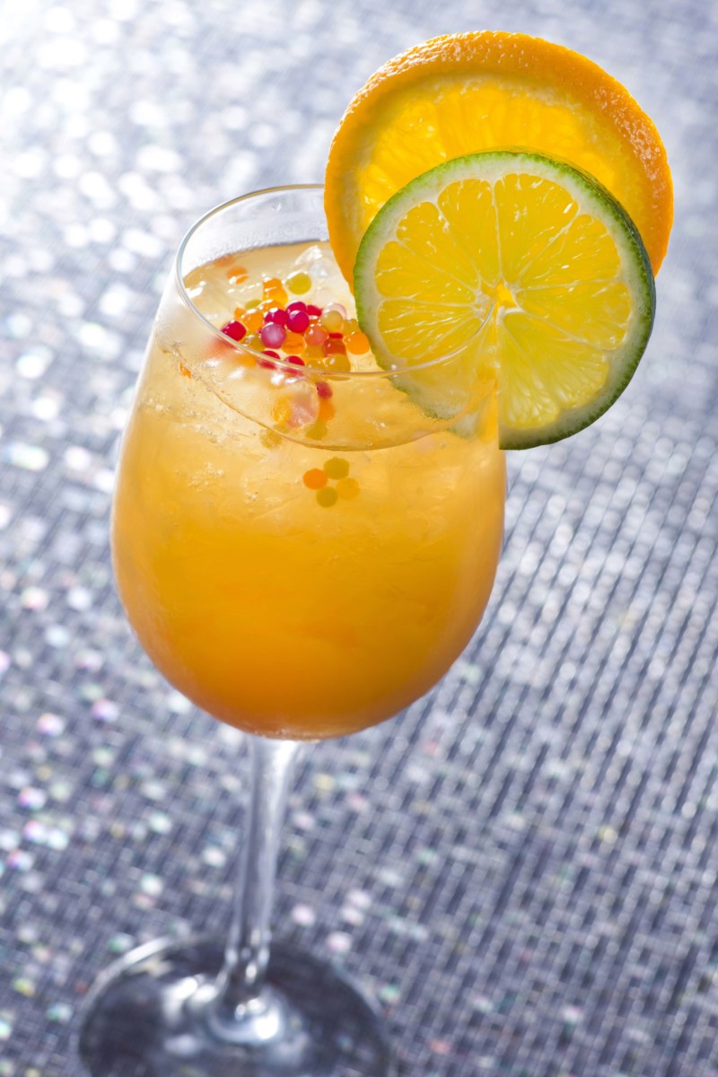 ブラッドオレンジジュース、オレンジジュース、 パッションフルーツシロップ、ジンジャーエール、 オレンジ、ライム、海藻ビーズが入っています。