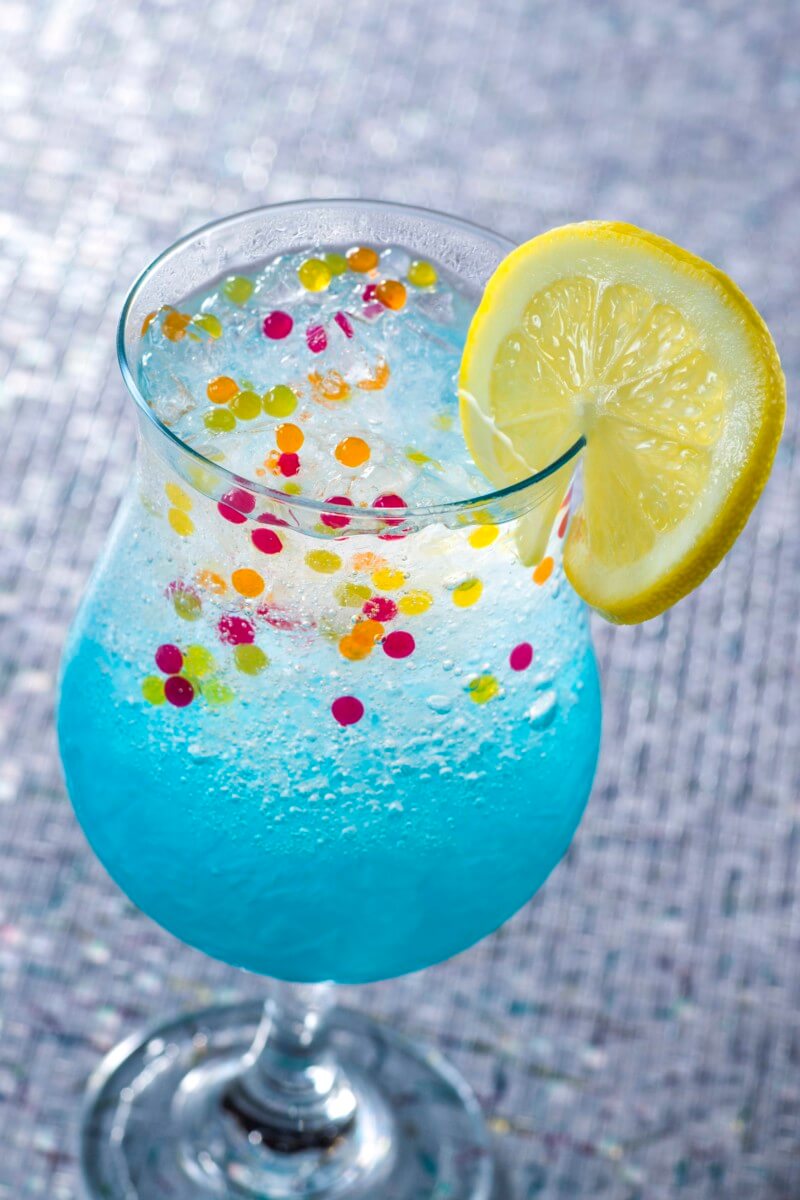 アップルジュース、パイナップルシロップ、 ブルーシロップ、レモンジュース、クラブソーダ、 スライスレモイン、海藻ビーズが入っています。