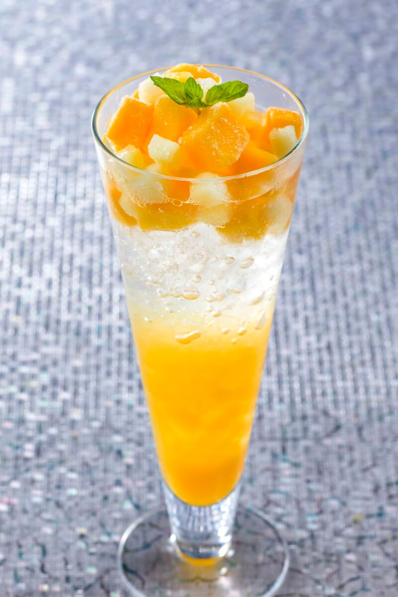 マンゴージュース、 パッションフルーツシロップ、ライチーシロップ、 クラブソーダ、フローズンマンゴー、 フローズンパイナップル、スライスレモン、ミントが入っています。