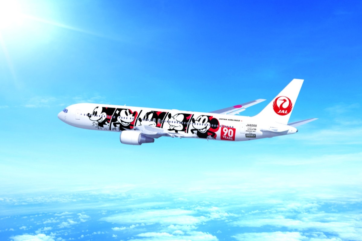 日本航空が就航するこの特別塗装機には“楽しい”や“楽観的” など様々な表情をしたミッキーが機体の左右に描かれ、機内では特別デザインのミッキーが施されたヘッドレストカバーや紙コップなどが登場します。