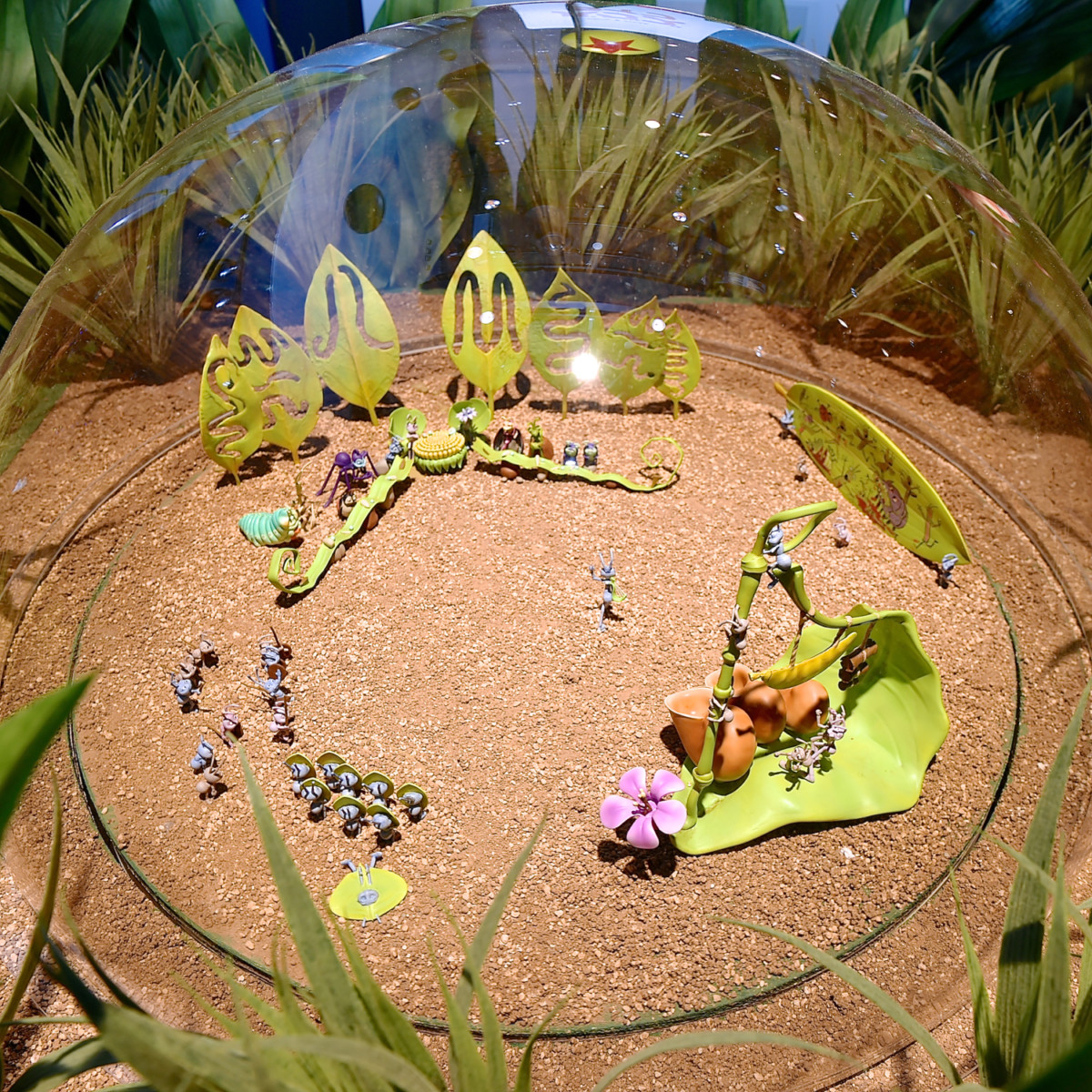 「フリック」や「ハイムリック」など、『バグズ・ライフ』のキャラクターたちを小さなジオラマで再現しています。