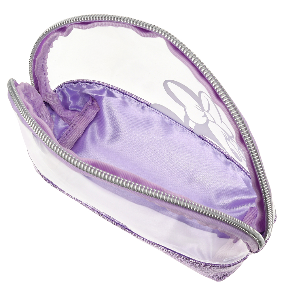ミニーマウスのお顔がデザインされた、女性らしいパープルカラーのビニールポーチ入り。