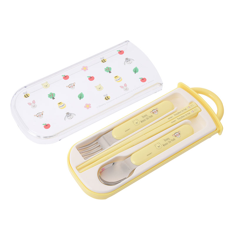 お箸、スプーン、フォークのセットは、りんごやみつばちのアイコンが配されたシンプルなデザイン。