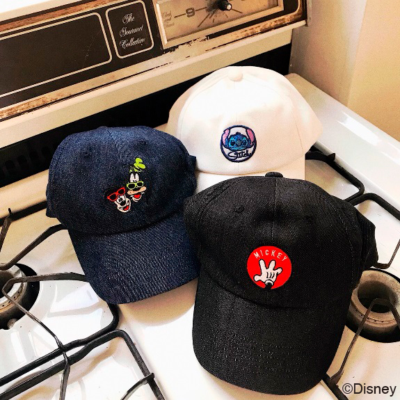 ミッキーの手やスティッチ、グーフィー&マックスが刺繍されたキャップはコーディネートのアクセントに。