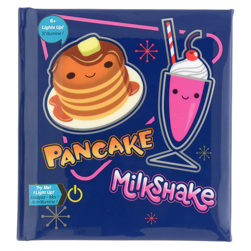 表紙の電源マークを押すと、パンケーキと可愛いドリンクの輪郭がネオンサインのように光るノート。