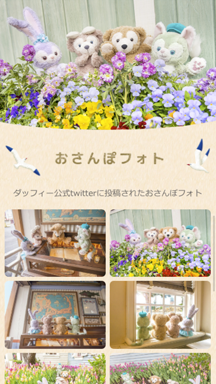 今回のスペシャル動画の他にもダッフィーの公式 Twitterに投稿したおさんぽ写真や動画のギャラリー集を見 ることができるコーナーも登場します☆