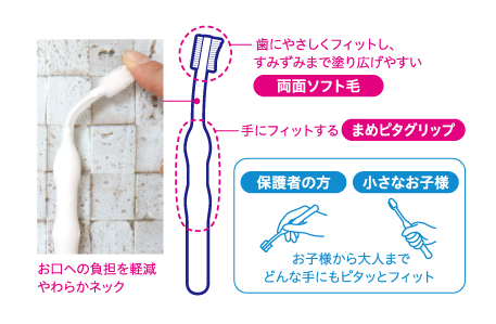 ハブラシは「両面ソフト毛」で歯にやさしくフィットし、やわらかネックで口への負担を軽減します。